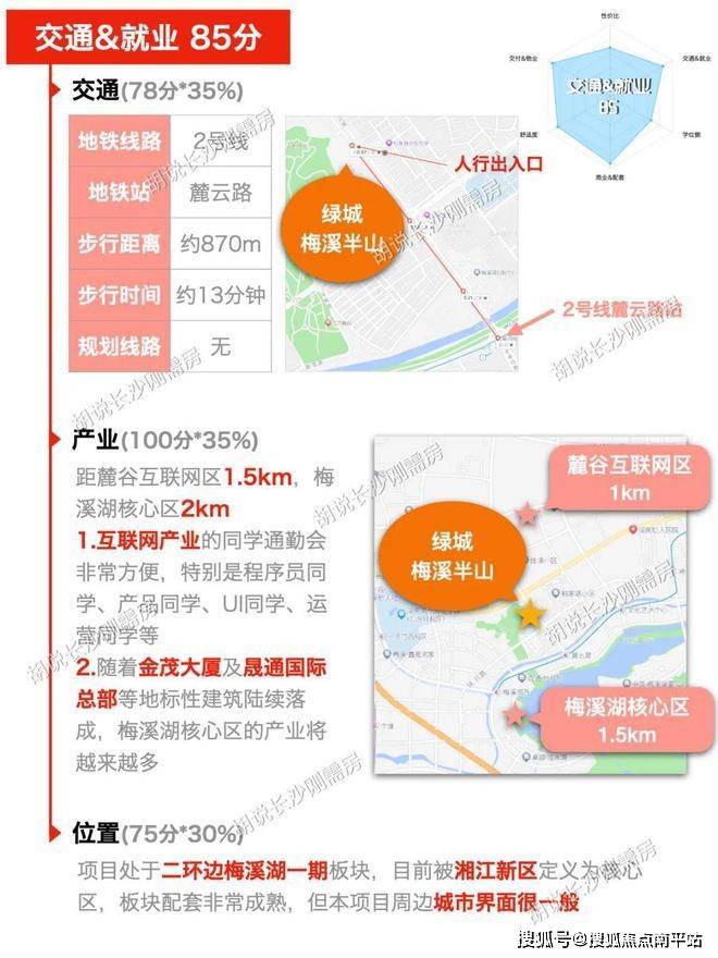 周边产业配套:麓谷互联网区(1km)、梅溪湖核心区(1.5km),产业配套多,可选就业方向多