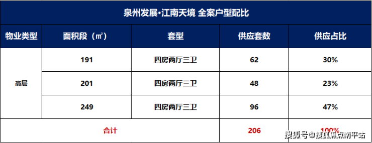 泉州发展江南天境项目5栋高层,共206套住宅,主推建面191-249平的纯粹全景大平层。
