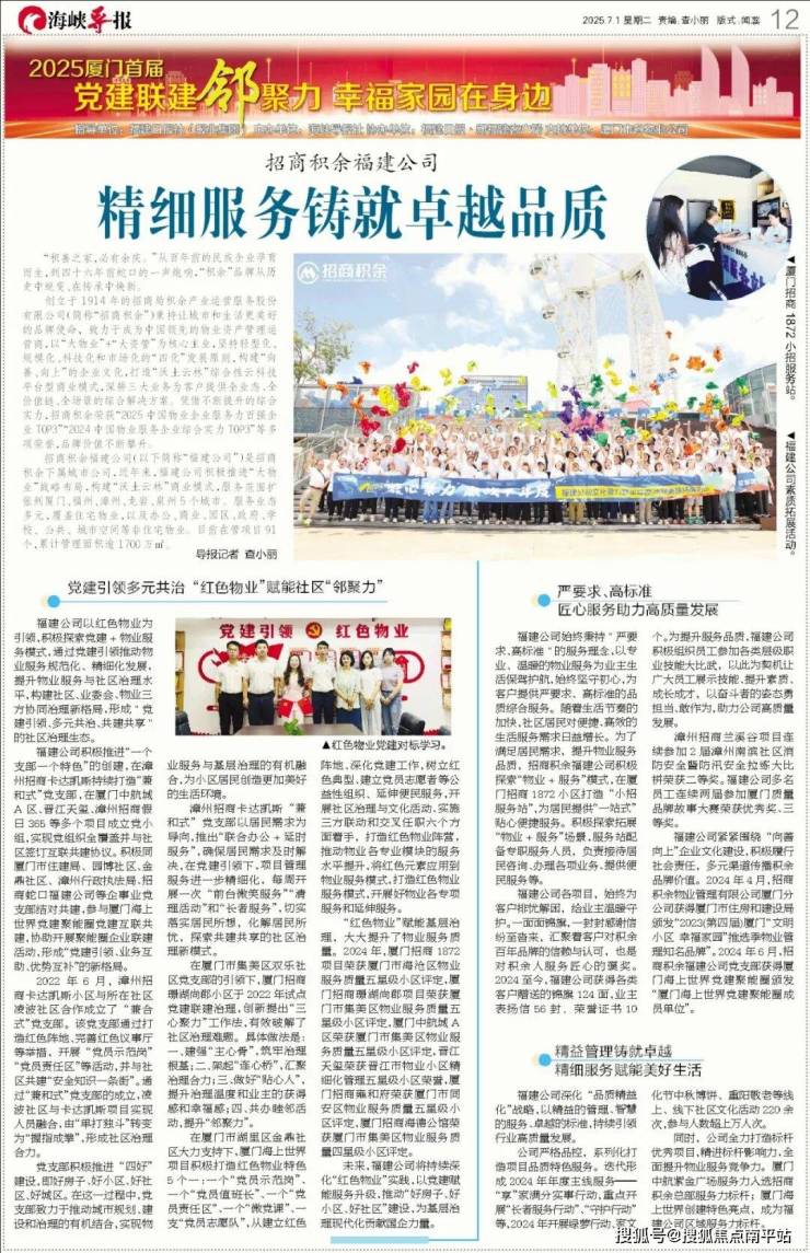 物联万家,让“好服务”营造”好生活”!由海峡导报社主办的2025年度"党建联建'邻'聚力 幸福家园在身边"物业采风季于7月圆满落幕。本次活动通过典型示范引领,有效提升物业服务管理水平,增强城市社区凝聚力。招商积余福建公司积极参与并斩获佳绩:旗下厦门招商1872项目凭借创新服务模式荣获"服务品质创新金牌案例";厦门招商璟湖尚郡项目以特色党建获评"小区党建联建治理成功金牌案例"。