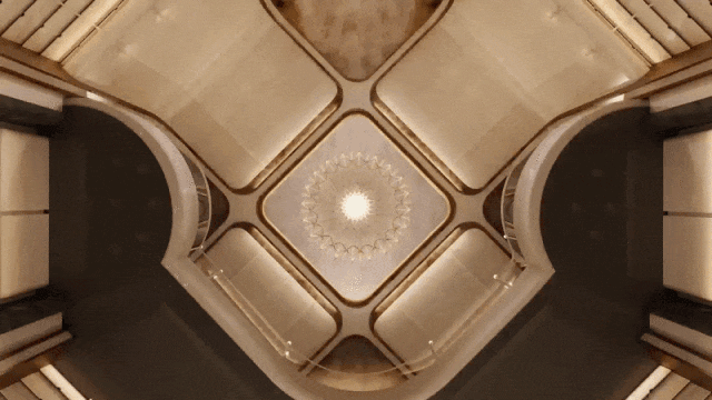 正八角形的平面布局自然形成45°放射的多向轴线。以八角厅为轴,城市与社区隔空相望,会所功能依势而分。多向对称的空间格局延续了传统礼序的庄重韵味,也演绎出现代美学的张力。轴线是隐秘的指引,将城市喧嚣收敛为社区静谧,在严谨的几何秩序中,完成空间与时间的对话。