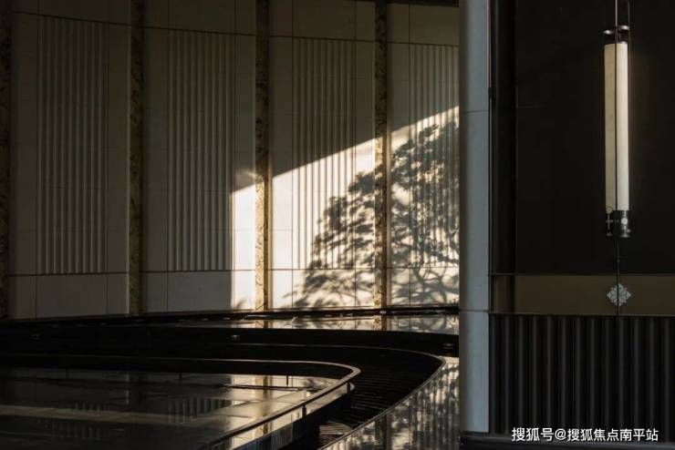 归家的仪式感,从隐奢门庭的前场徐徐开启。长约50米的扇形雨棚如华盖般舒展。六扇叠层石材屏风与十二道景屏静立于叠级水景之上,如翼伸展,环抱相迎,共同围合出一方归家前的灰空间。这里,是抵达宁静的过渡庭院,也是归途中的心灵栖所。