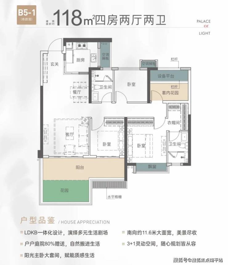 A区组团规划118㎡-143㎡三大四房户型,户型客餐厅LDKB一体化设计,演绎多元生活剧场,动静分区,坐拥超长南向面宽。不仅如此,全部户型都打造有私家花园,装下你的诗和远方。