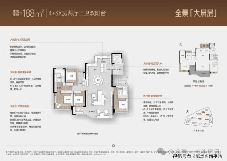 建面约188㎡ 全景「大屏层」4+3X房两厅三卫双阳台◆ 双入户动线、17.5米超大面宽、空中浮岛等独创设计,阔揽城市盛景。