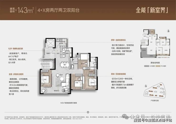 建面约143㎡ 全能「新室界」4+X 房两厅两卫双阳台◆ 打造四开间朝南、可拓展的超大横厅,灵动百变定制全能生活。