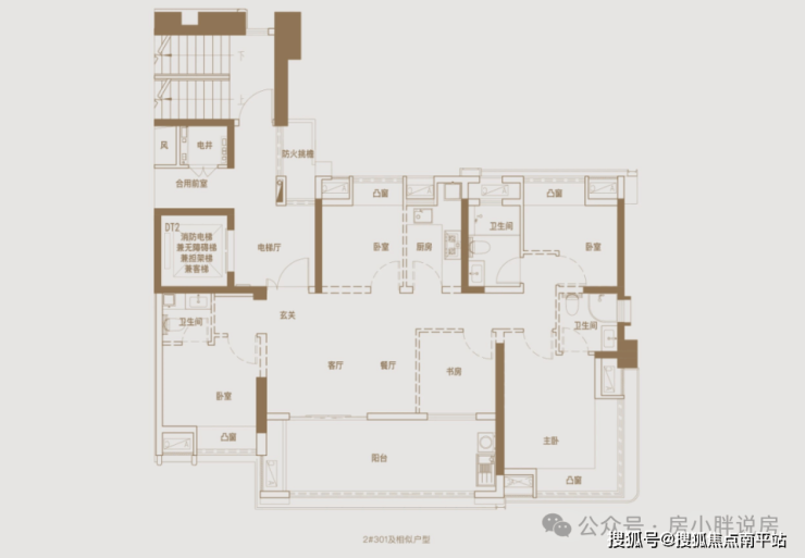 136平米:四房两厅两卫,位于大高层,独梯设计,这个高度做独梯会略微不便,大面宽设计,做了三卫,其中一个是暗卫,主卫也较小,整体布局依然是市场主流。