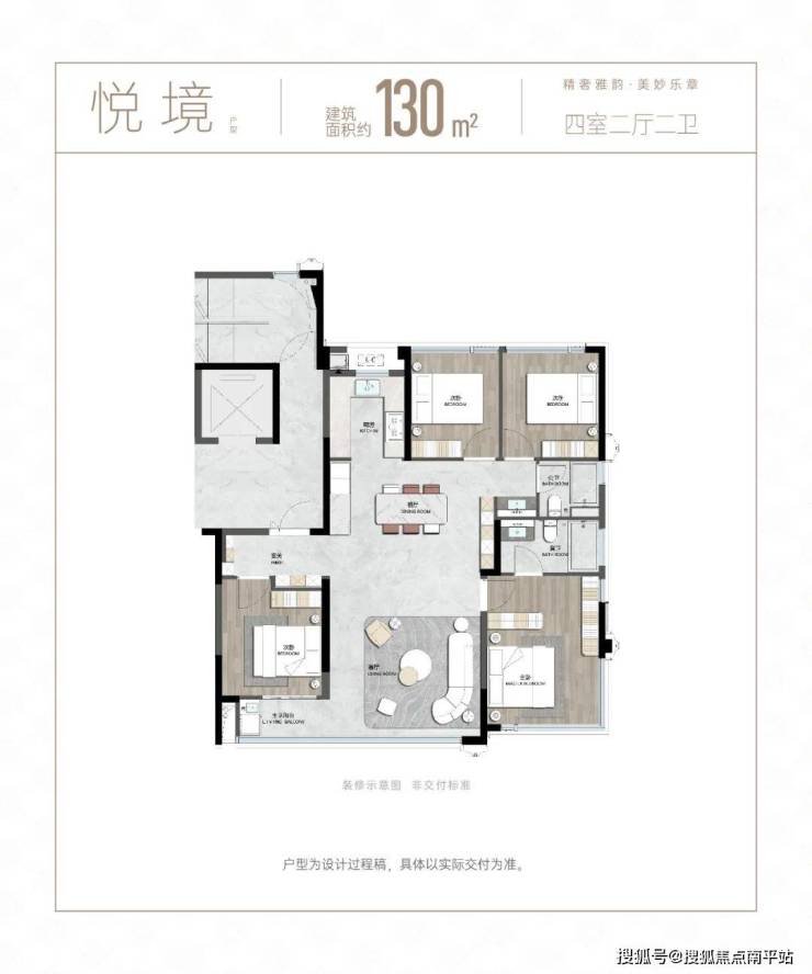 中寰悦府建筑面积约130㎡悦境,规划四室二厅二厅二卫,为南向3开间,拥有全通透公区,主卧两面连贯的270°转角飘窗。