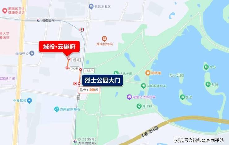 项目紧邻长沙主城最大的城市公园——约2100亩烈士公园(年嘉湖公园),步行距离仅约200多米。
