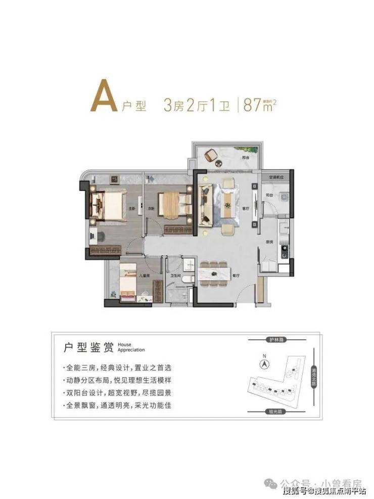 其中 87㎡三房两厅一卫是刚需主力,总价约 340 万起,三开间朝南,客厅衔接 5.8 米阳台,主卧带飘窗,厨房预留双开门冰箱位,虽然面积紧凑,但空间利用率较高,很适合在周边上班的年轻白领。