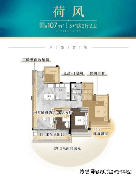 107㎡四房两厅两卫总价约 428 万起,全南向布局,动静分区清晰,客餐厨空间衔接流畅,每个卧室都能放下标准床具,适合成长型家庭。
