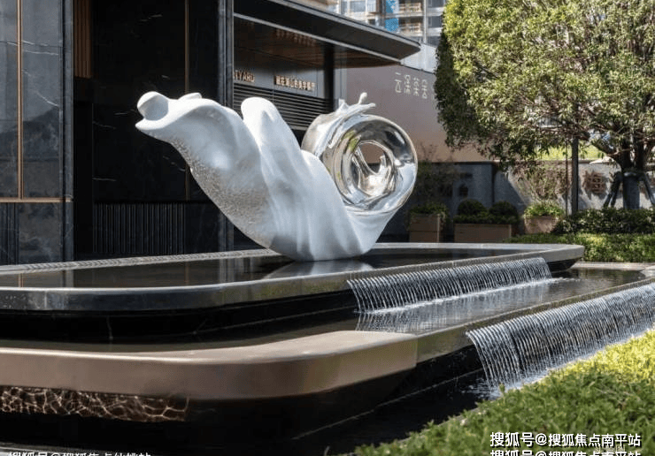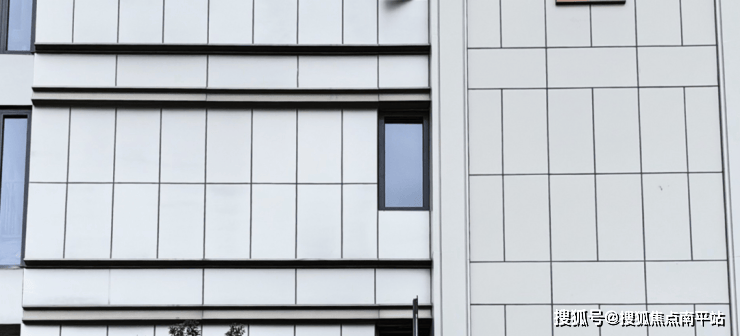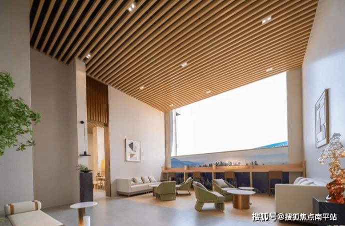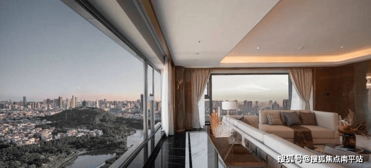 采用大面宽玻璃幕墙搭配金属铝板线条,南地块客厅转角创新采用造价更高的弧形玻璃,以更高成本、更精密工艺,保证立面的美观性,勾勒轻盈、透亮的无界天幕。