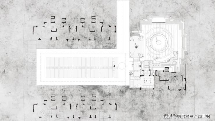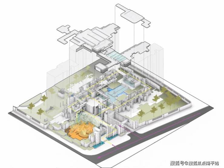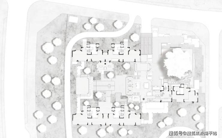 示范区以“回型动线”展开叙事:外圈是连贯的展示与归家路径,内圈则围合出层层退台的庭院。塔楼底部的架空空间也被纳入这一系统,让人可以在不同高度间穿行、驻足、回望。行走其中,建筑、庭院与景观渐渐融为一个可漫步、可回游的生活场景。