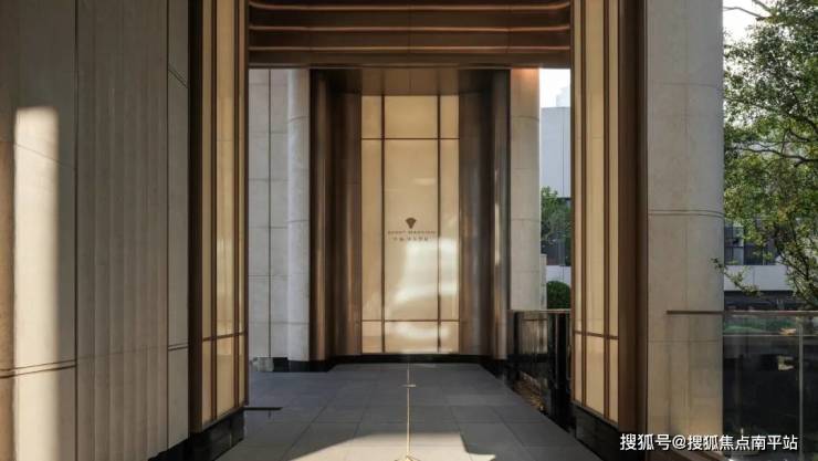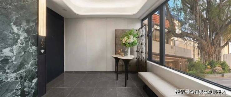 步入4米宽的归家走廊,外侧可以看到百年榕树与榕树广场的盎然绿意,静谧自然的氛围扑面而来。内侧以透光石材吊顶与装饰墙面营造奢雅质感。回望10米高的门头,空间的序列感与仪式感相互交织,构筑出温馨而尊贵的归家体验。