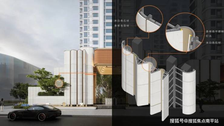 本项目精心选用了体现在地性的石材,辅以不锈钢及铝板做细节线条设计。在主材构造、尺寸把控、去胶化、密拼工艺、弧形造型的落地,严抠交接,坚持材料的完整性等维度都给与高度关注。