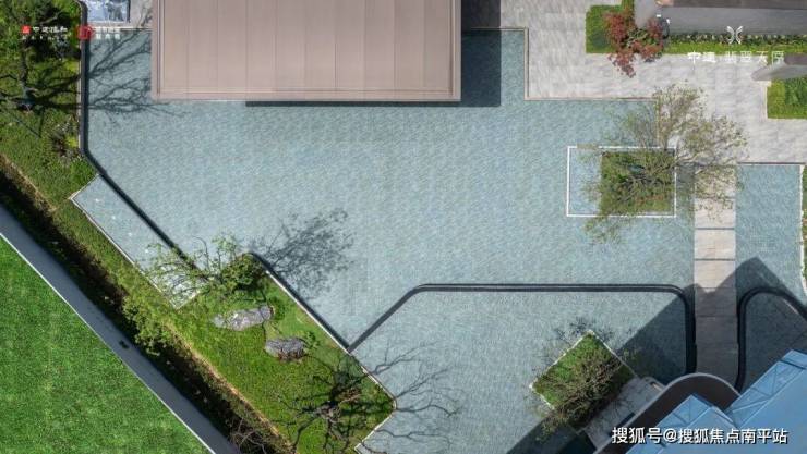 约500㎡的度假水庭+底部蓝绿色石材,水波荡漾,犹如蓝色果冻海。