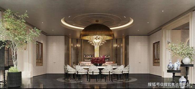 旋转楼梯搭配鎏金玻璃光塔的大型装置,与水面波光粼粼交相呼应,宛如一幅巨大的立体画卷;四水归堂通过现代艺奢手法表达,超高水幕墙倾卸池底,放置行舟定制艺术陈设更是点睛之笔,让人感受到隐奢豪宅的气度与格局。整个空间,就像进入一个现代文化艺术馆,别具一格。