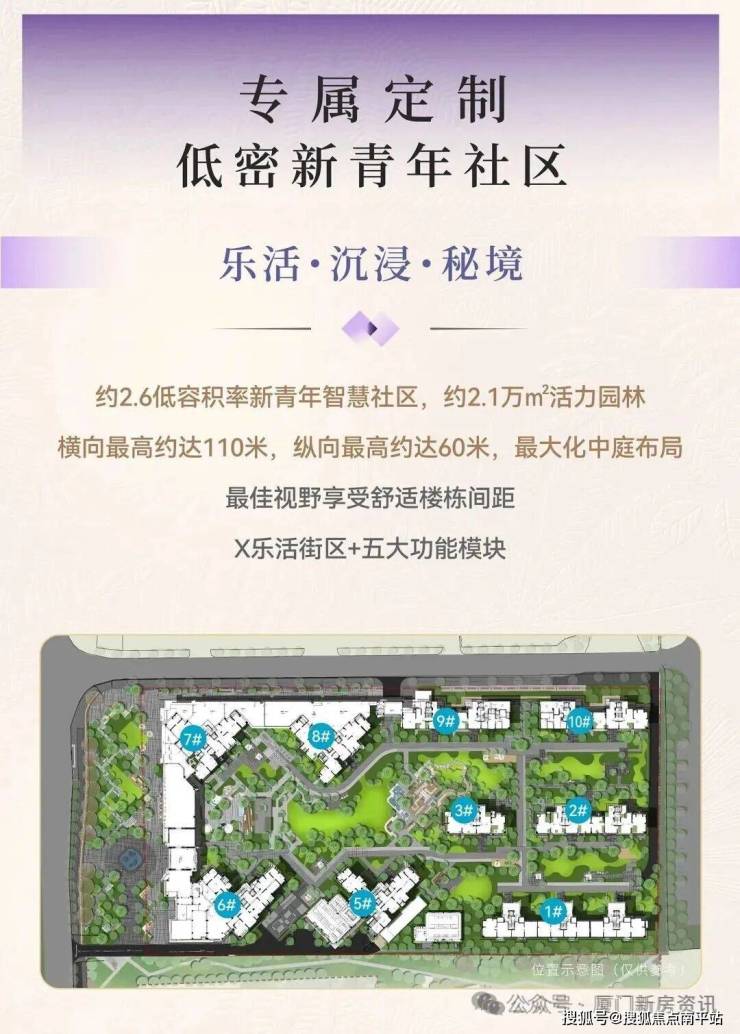 项目容积率约2.6,规划约2.1万㎡活力园林,楼间距较大(横向最高约110米,纵向最高约60米),最大化中庭布局。
