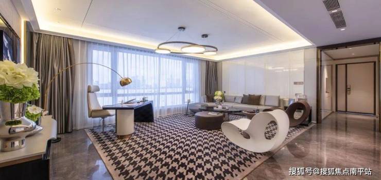 170户型样板间以“商务”、“精英”为故事灵感,选取保时捷911系跑车永恒经典的流线型,利用户型宽厅的特点,将客厅部分以商洽及办公的布置形式进行解读;