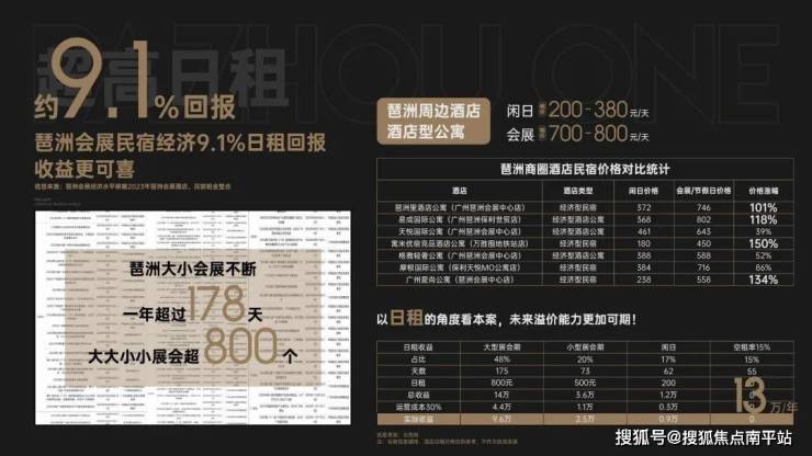 2023年琶洲展会全年举办800场,共178天,以会展租价计算,一年最高可达13万/年超高收益,民宿经济约 9.1%!
