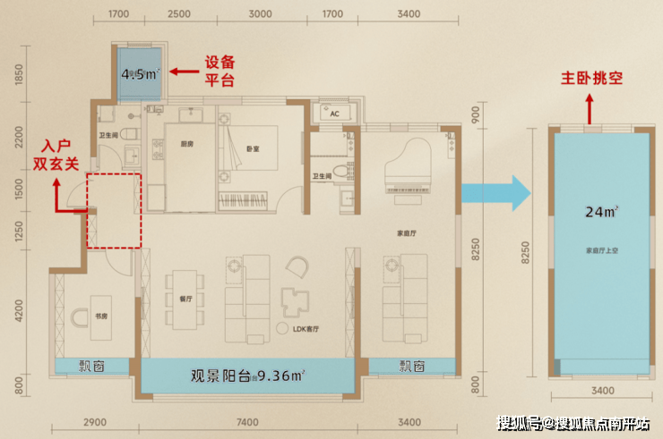 同样的,南向阳台赠送面积达到约9.36㎡,南向双飘窗约3.8㎡、设备平台约4.5㎡。