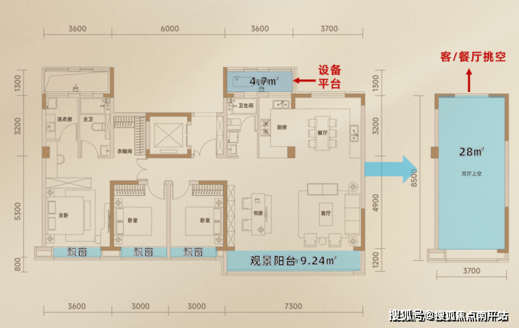 面积赠送方面,除了9.24㎡的阳台、5.3㎡的南向飘窗、4.7㎡的设备平台这些常规部分,另一大“重头戏”便是在挑空上。