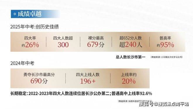 根据拿地协议,润和天心序可配套入读长郡外国语实验中学南校区,小学就近入读长郡外国语实验中学附属小学,带名校双书包,贯通式培养,孩子未来培优、拔尖更具优势。郡外有多牛,可能湖南老乡都了解, 2025年中考成绩创下历史新高:四大名校录取人数超300人,四大率达26%,普高率高达95%,多项指标位列全市第一,已比肩长郡双语等顶尖公办。