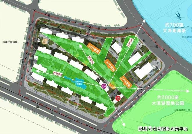 东侧和南侧:也可以看到大泽湖湿地公园景观,尤其是约230米视距可以最大化地将核心园林景观收入眼中。