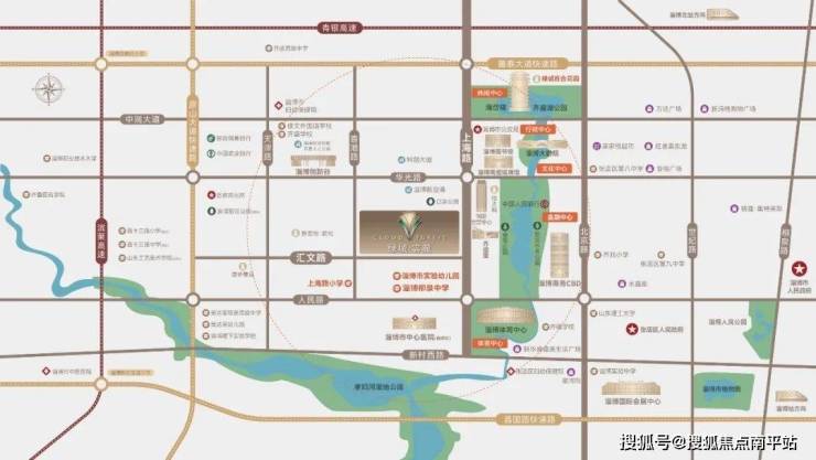 项目选址于上海路与汇文路的交会处,地处淄博发展主轴与 CBD 核心区的黄金地带 —— 东侧紧邻城市主干道上海路,南侧衔接静谧的汇文路。周边不仅有齐盛湖公园、金带公园等生态景观环绕,柳泉中学、上海路小学等优质教育资源也近在咫尺,完美呈现出 “出门即享都市繁华,归家便拥静谧生活” 的独特区位优势。