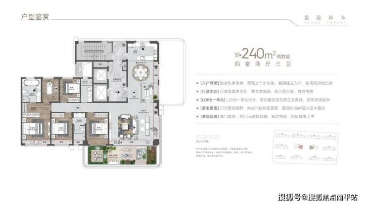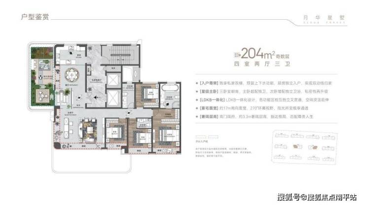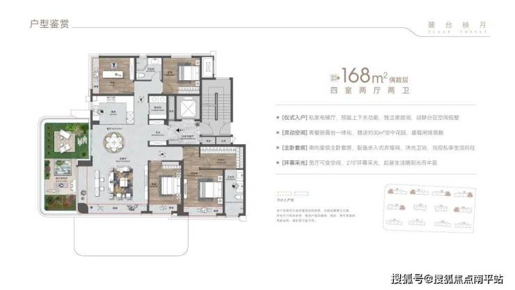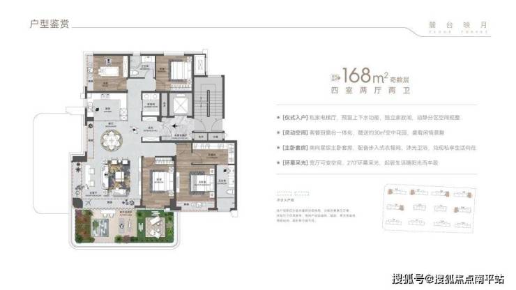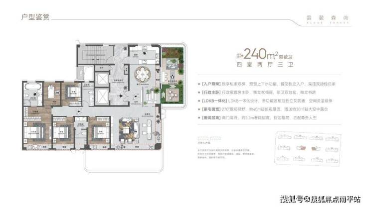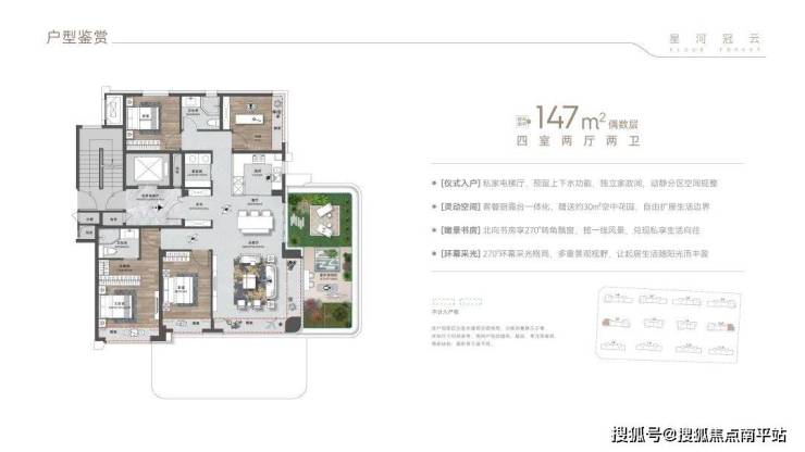 168-240㎡空中院墅:创新引入“双首层”概念,通过错层设计实现6.5米挑高客厅,部分户型配备270°环幕露台,将庭院概念引入空中。