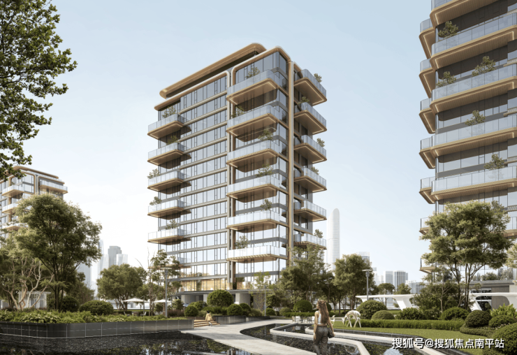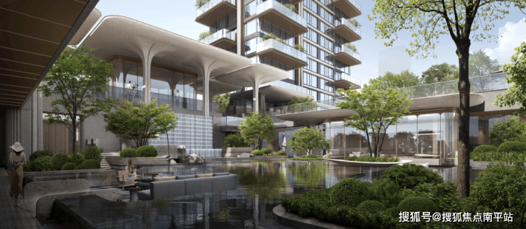 更值得一提的是社区整体抬高 6.5 米的巧思设计:既巧妙隔绝了城市道路的嘈杂,又借助叠水景观与下沉庭院形成的垂直落差,营造出 “山在城中矗立,城融园中生长” 的沉浸式意境,让居者随时感受自然与生活的交融之趣。