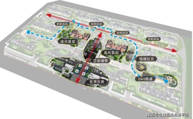 健康环线:500米夜光跑道与老年康体区、儿童探险乐园有机衔接,满足全龄段需求;