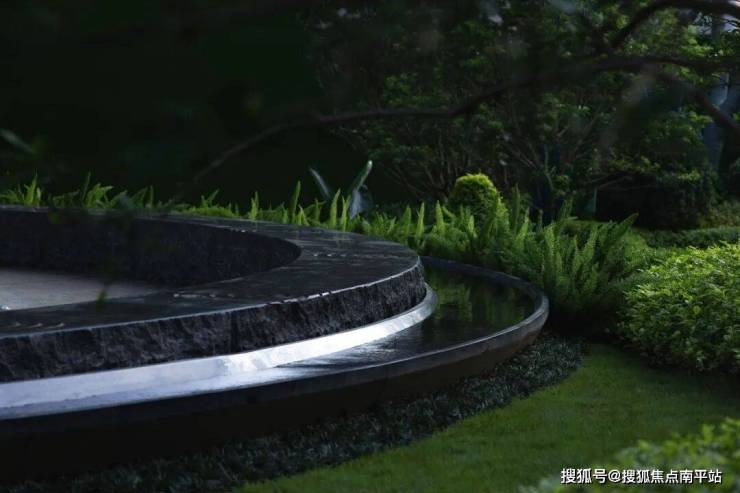 登高面一侧,水幕与石材肌理相融的水景景墙成为视觉核心。错落的植物组团与精致户外家具相得益彰,这里可以是星空下的会客厅、晨曦中的瑜伽台,也能是独自凝望城市天际线的思考角落。