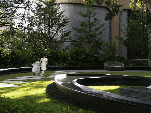 雨林花园以光影为笔,水系与植物空间相互渗透,让空间充满呼吸感与生机。洁白水磨石汀步搭配热烈红色坐凳,为整体增添浪漫气息。