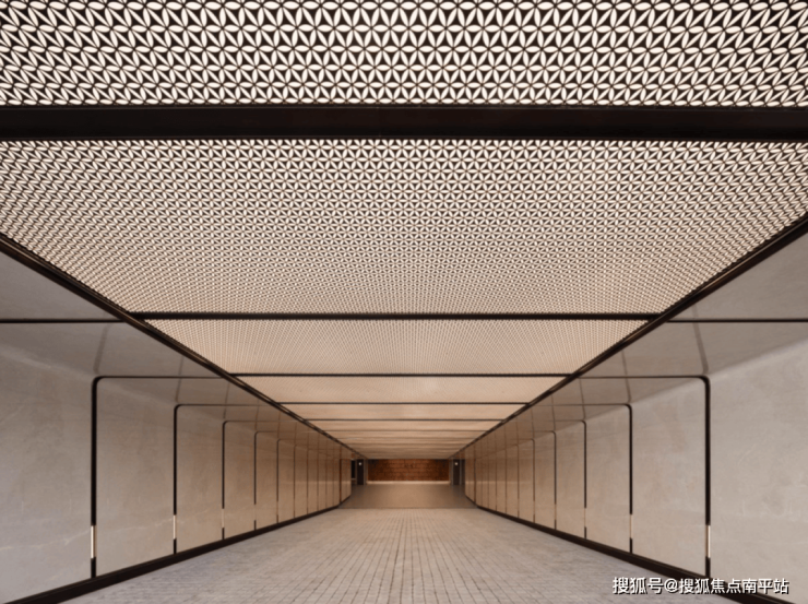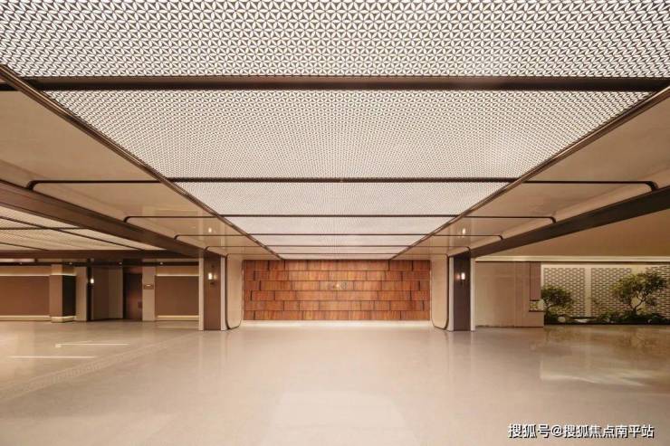 归家大堂门头约45米的超尺度挑檐,简约而不简单,融入了解构南通非遗藤编的细节纹理。