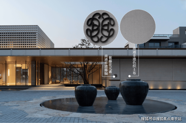 南通非遗藤编工艺与金属烙刻技艺融合,让紫藤花标识在现代空间中绽放新姿;沙漠风石材邂逅南通非遗色织土布工艺,千年文脉以现代建筑语言焕发新生。