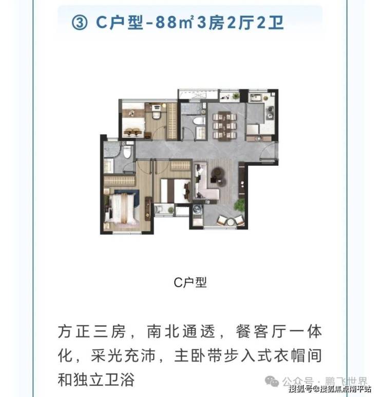 88㎡南北通透三房两卫实现“小面积墅级体验”,创新性3.1米层高与270°转角飘窗优化空间感。