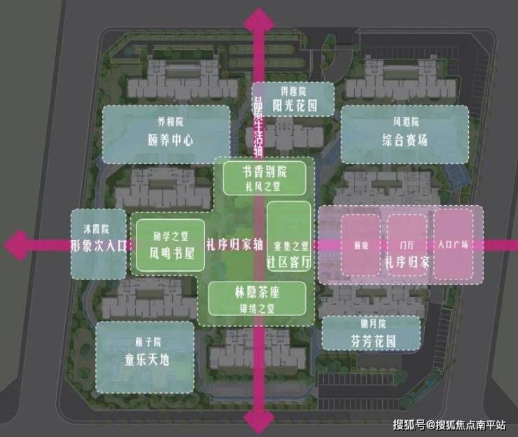 ▷诗画园景 丰获生活灵感项目传承凤鸣书院的空间格局和文人雅趣,,呈“一环、一心、两轴、六进空间及八大主题院落” 串联整个空间序列,打造多层庭院递进的景观空间结构,形成一处兼具人文内涵与时尚居住的现代社区,营造书香浸润的独特景观体验。