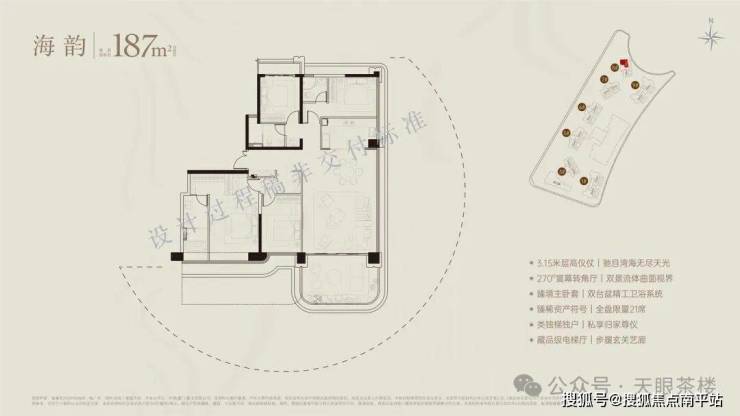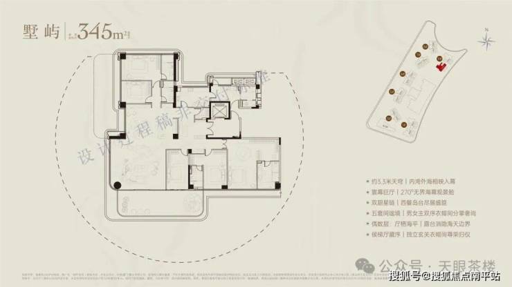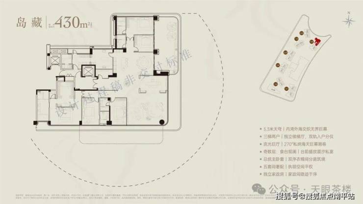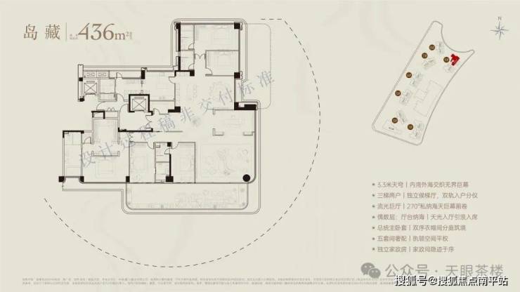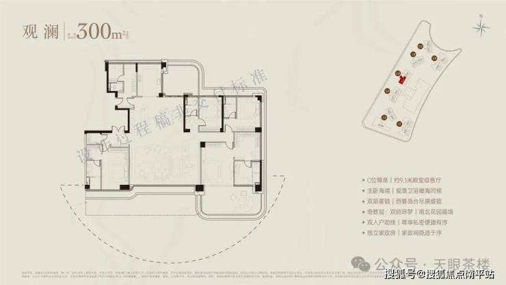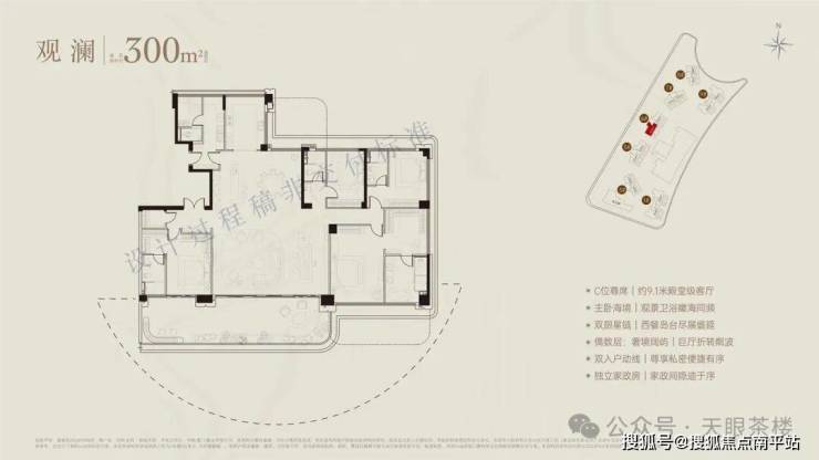 如果说236平以下均为双套卧,无家政保姆间,那么300平及以上户型,已经出现双入户动线,3套卧或更多,另带家政保姆间,且9号楼头排拥有270度海天巨幕瞰景视野,生活再进阶。