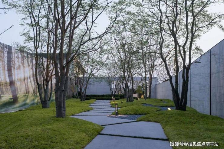 在建筑与自然之间建立微地形景观,前庭院空间以折线式和自然式地形展开,利用景墙隔绝外界喧闹吵杂的环境,逐渐进入一个静谧的密林空间。