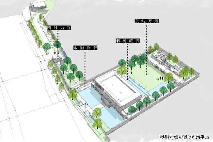 整个展示区景观空间主要包含四大主题场景,设计方式在于解决展示区面积的局限性,在设置浏览动线时,前场加强折线的体验感,由曲折到开阔,后场则以“水树”之意表达静谧。