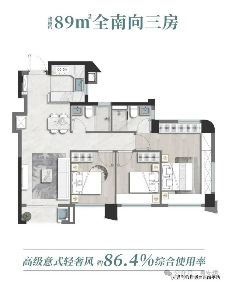 户型设计上,约12.35米南向四开间,保障了最长约6-8h的充沛日照,充分体现了“健康好房子”的产品理念。