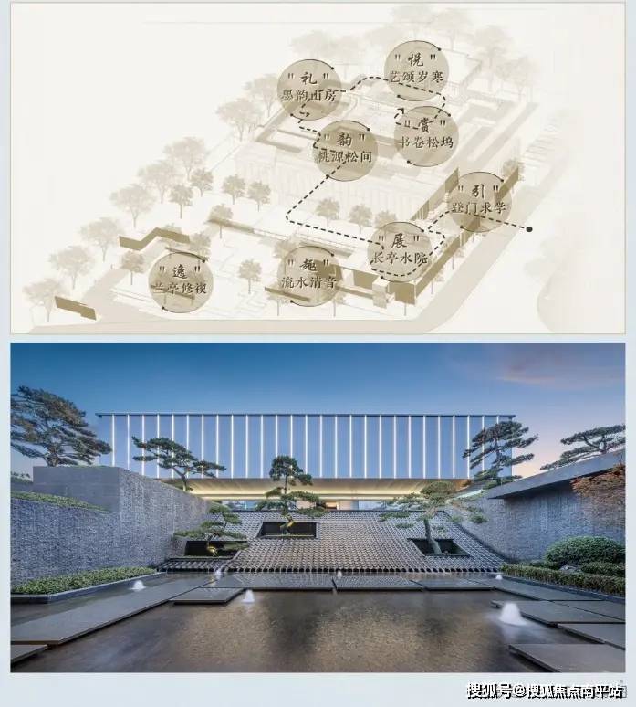 项目在示范区构造上结合山水自然、书学文化,通过以“登门求学、长亭水院、流水清音、兰亭修禊、桃源松间、墨韵山房、艺颂岁寒、书卷松坞”八景宅院画境,将「岳麓八景」的别径、竹林、鸣泉、曲涧等风雅情景凝练于一园,并以“引-礼-趣-展-逸-韵-悦-赏”空间节奏循序递进。让园林空间从“画境”升华到“意境”打造一个符合当代湖湘审美的书学艺术空间。