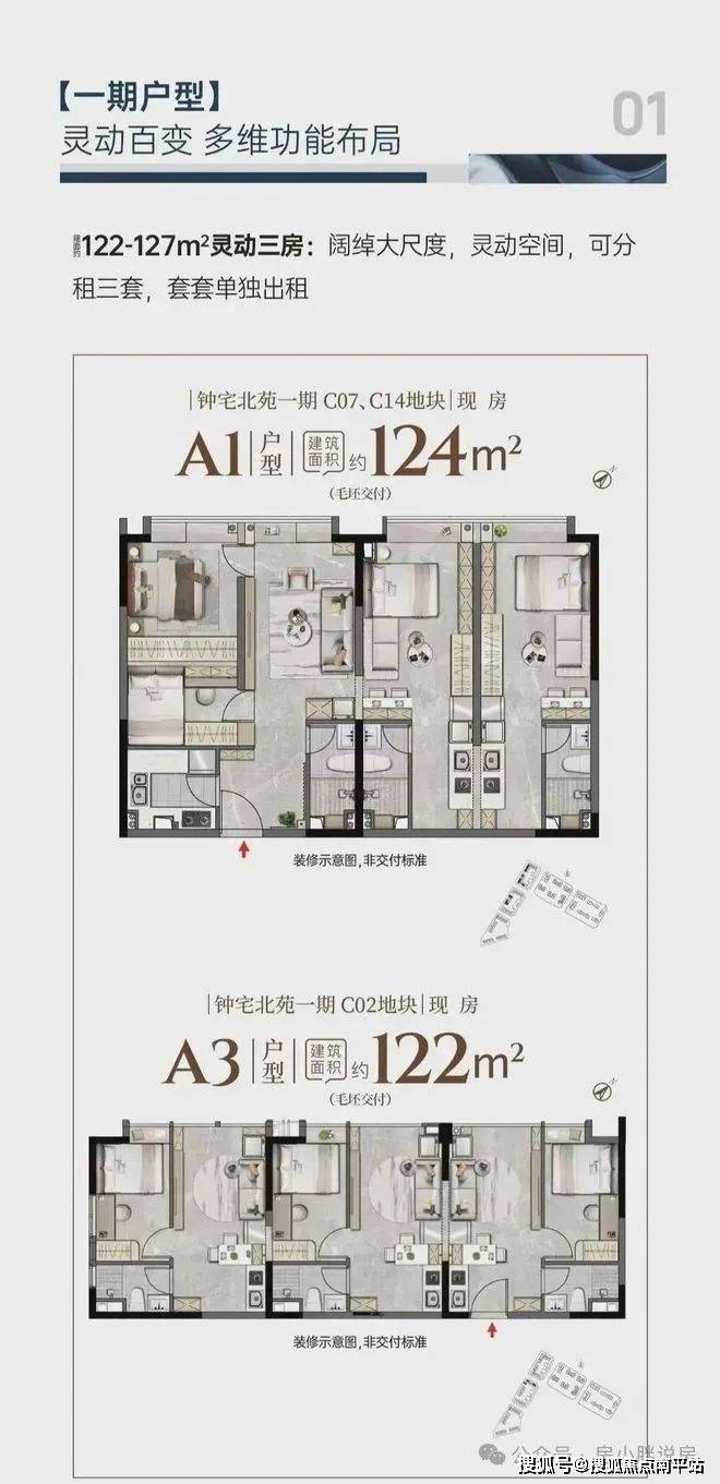 一期约122-127㎡,二期约120㎡户型。其中钟宅北苑一期户型分割成3套,可自住,比如和老人/其它亲人分开住,各享宁静;亦可出租,湖里创新园(直线距离约500m),企业云集,租客需求旺盛。二期规划的户型更适合自住,120㎡做大三房,阳台很大。