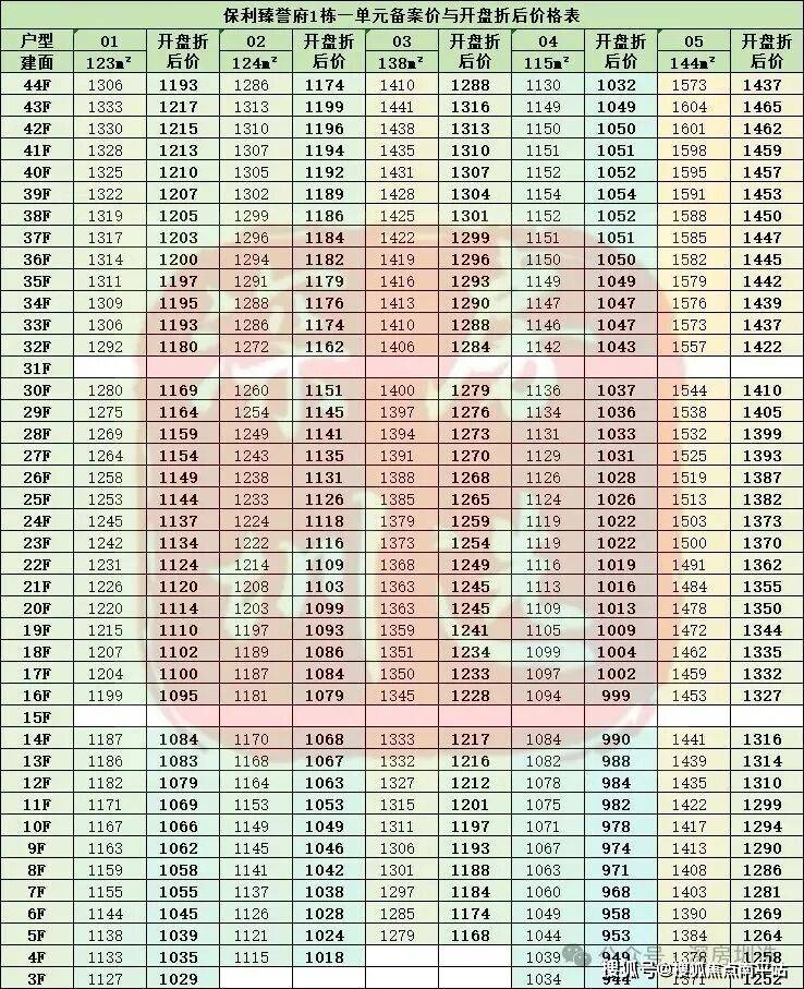 保利臻誉府1栋一单元备案价与开盘折后价格表(仅限开盘当天)