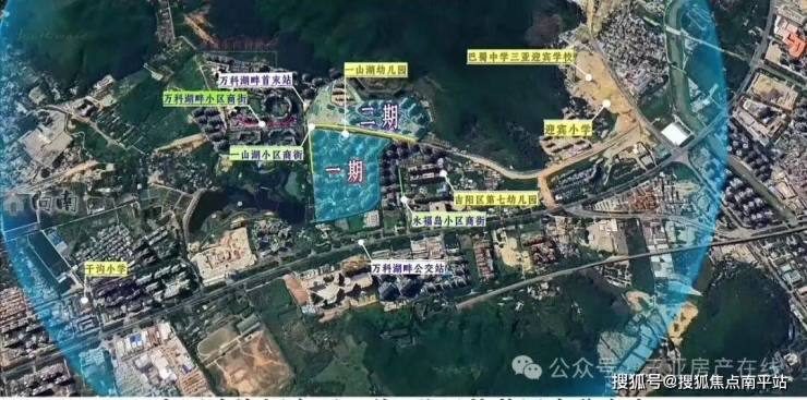 一山湖项目总占地约619亩,共分为两期开发建设。一期的南侧、东侧和北侧分别与海螺岭路、万科湖畔小区、吉阳湿地公园、未名湖、迎宾路、永福岛小区以及鸿坤山海墅小区相邻,二期的南侧是万科湖畔小区,西侧是尚处于建设中的山海田园小区以及4栋搁置多年的烂尾楼,西北侧是海螺岭和鸿坤山海墅的别墅区。一期与二期之间是已建成但尚未全线通车的一山湖路。