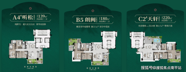 项目以建面约139-352㎡四代空中院墅为核心产品,打造户户标配6米挑高南北双庭院的低密住区,综合使用率超110%,部分户型最高赠送约108㎡露台,以双主卧套间设计与独立电梯入户,为居者营造极具仪式感的归家体验。从适配三口之家的139㎡四房,到占比36%的159㎡主力户型,再到满足多代同堂的352㎡家族大宅,每一款户型都精准匹配不同家庭的成长需求:
