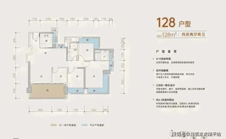 128㎡的4房2厅2卫,设计的是经典竖厅格局,进门入户玄关,客厅3.65米开间,四开间朝南,动静分区,主卧+1个次卧270度大飘窗,客厅连接次卧出6.15米长大阳台,4个卧室分别做到了主卧20.14㎡/次卧11.28㎡/次卧10.58㎡/次卧6.37㎡(包含墙体飘窗),得房率约:77.39%(不含赠送),东南朝向。赠送面积21.54㎡,加上赠送得房率94.45%。