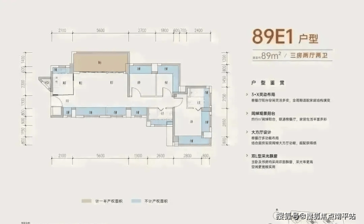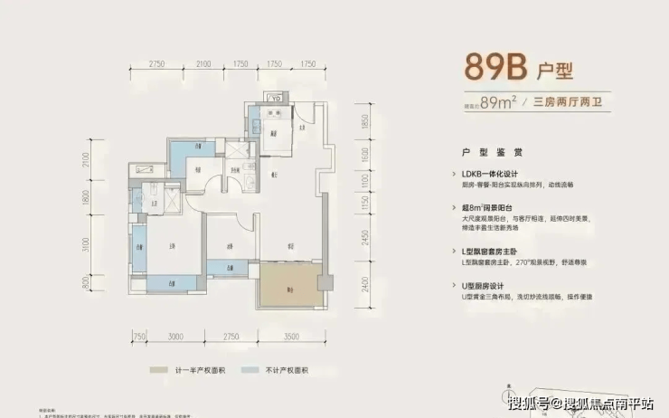 89㎡的3房2厅2卫,B户型,设计的是经典竖厅格局,进门入户玄关,客厅3.5米开间,三开间朝南,,主卧+1个次卧270°飘窗,3个卧室分别做到了主卧15.1㎡/次卧8.52㎡/次卧7.77㎡(包含墙体飘窗),得房率约:77.39%(不含赠送),西南朝向。赠送面积16.96㎡,加上赠送得房率96.84%。