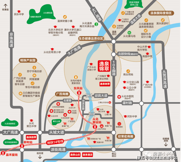 1.大广高速/G45——经街口收费站——沿从化市区方向——G105国道——沿路直行约10公里——越秀逸泉锦翠;
