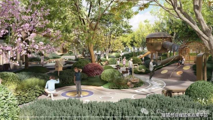 津彩成长公园打造“先游园,后归家”的归家礼序,内部融合橡果乐园、亲子互动寻索营地、草坪剧场等功能。