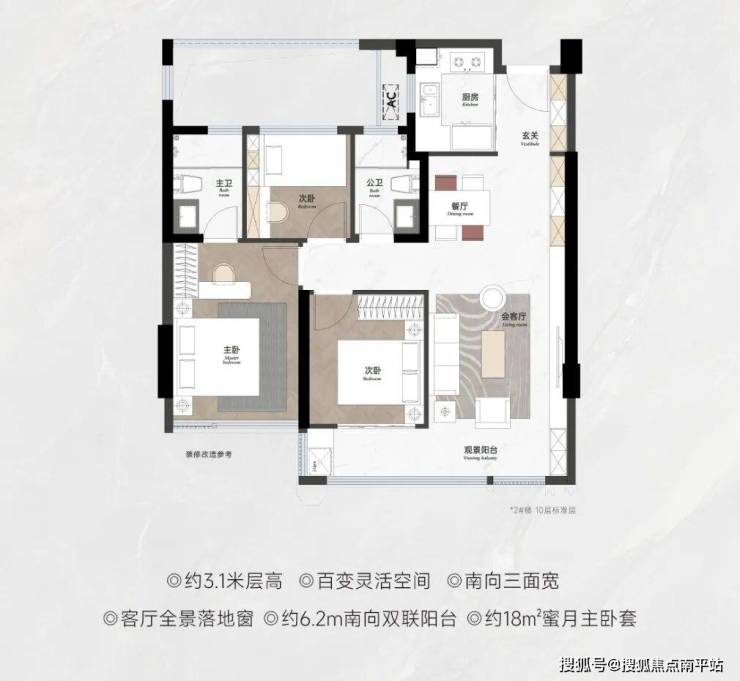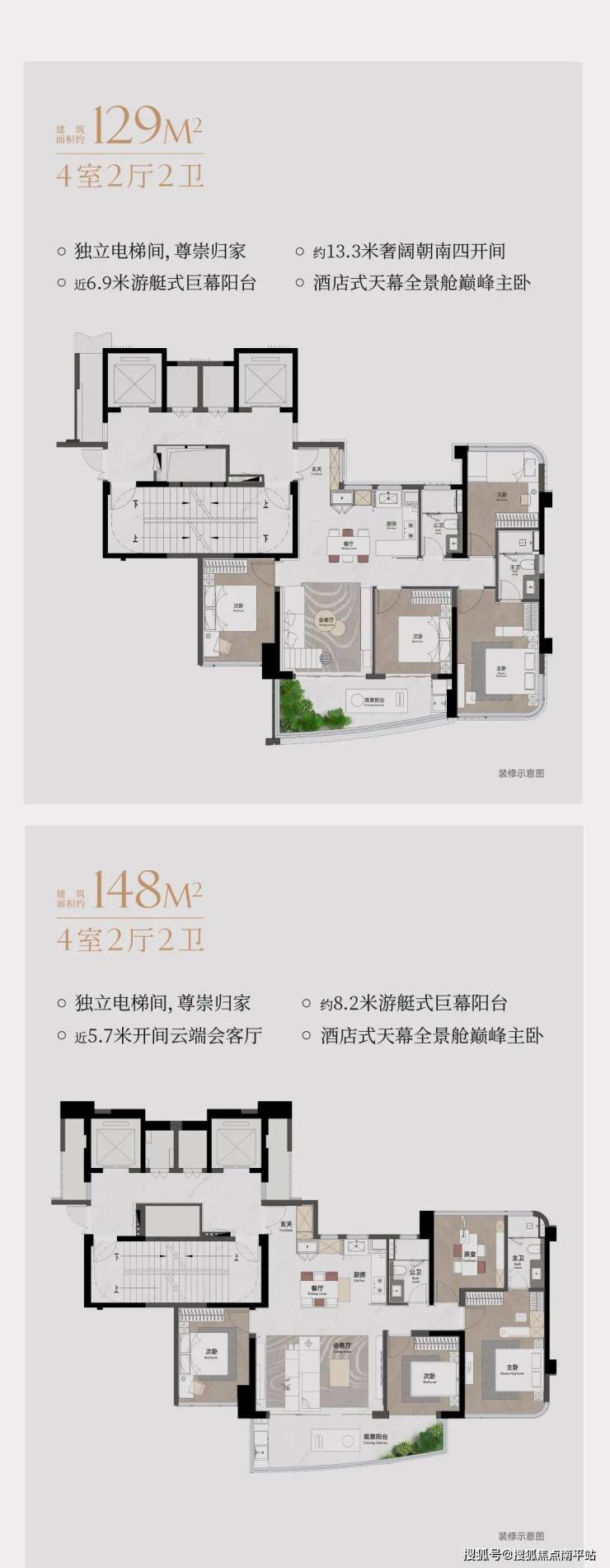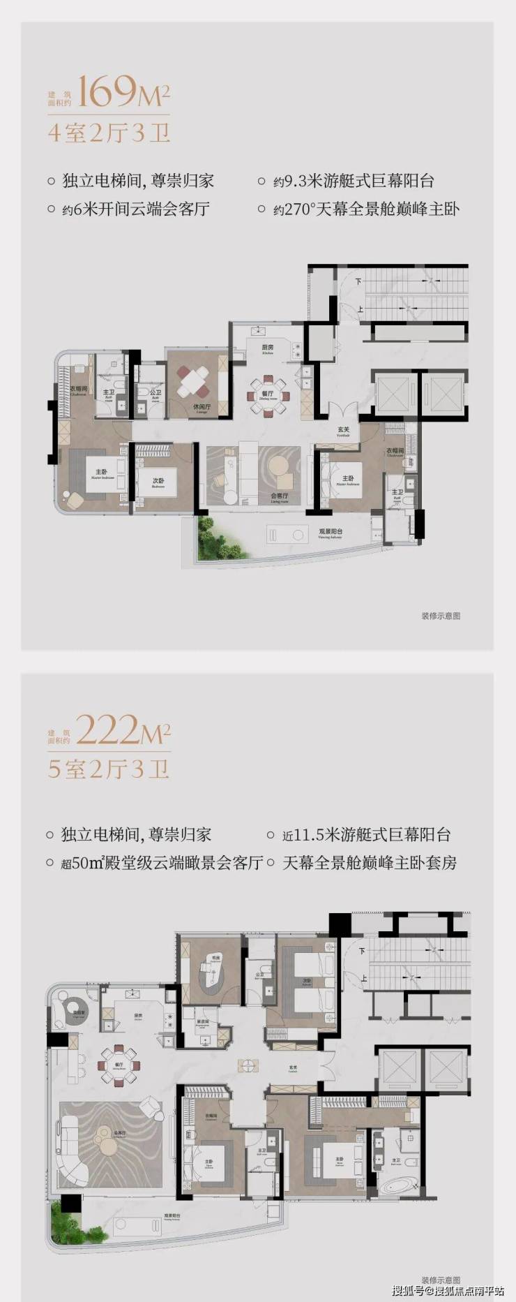 169㎡四房两厅三卫(深度改善)双主卧套房,三卫设计,空间尺度奢阔;270° 观景视野,适配改善家庭。